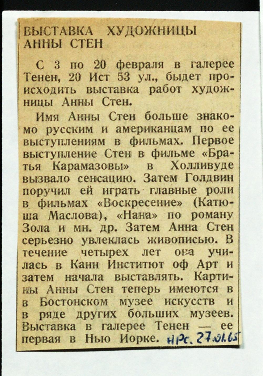 Выставка художницы Анны Стен // Новое русское слово. 1965. 27 янв. Aнна Стэн // Википедия |