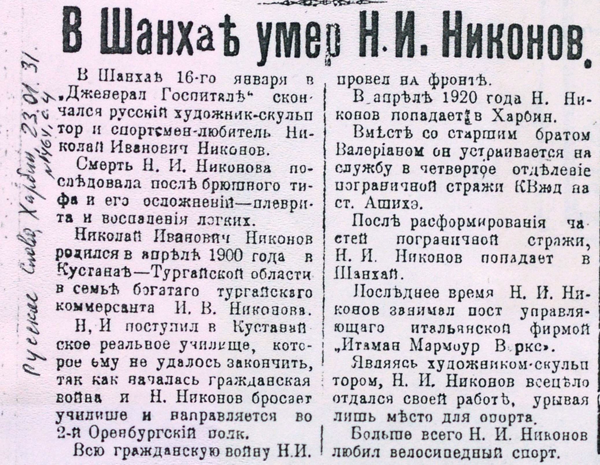 В Шанхае умер Н. И. Никонов // Русское слово (Харбин). 1931. 23 января. |