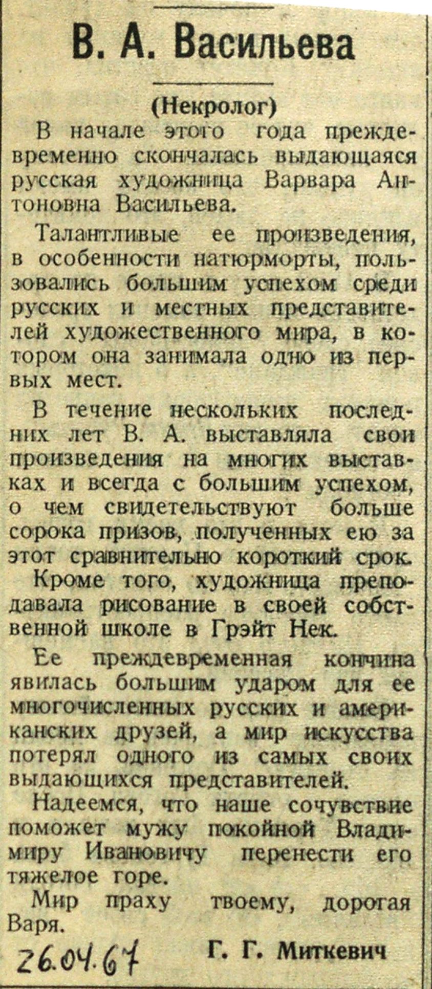 З-н В. Осенняя выставка в Гренич Виллэдж // Новое русское слово. 1966. 8 февр. [вырезка]. Миткевич Г. Г. В. А. Васильева. Некролог // Новое русское слово. 1967. 26 апр. [вырезка]. Зродловский К. Одиссея одной русской девушки во время Гражданской войны 1918–1920 годов // Libma.ru. Военная история. |