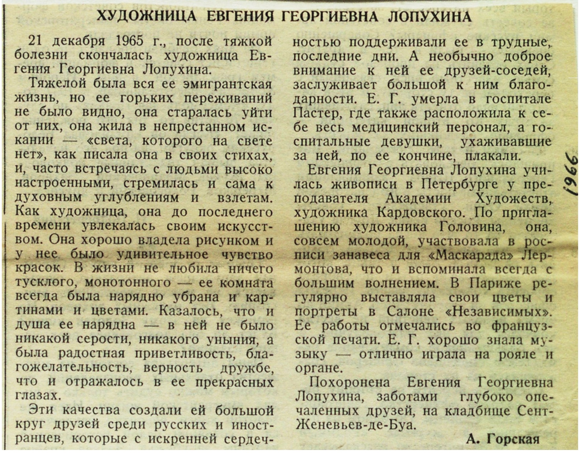 * РЗФ. Горская А. Художница Евгения Георгиевна Лопухина // Русская мысль (Париж). 1966. 15 февр. (№ 2426). Русская мысль (Париж). 1966. 20 дек. (№ 2558). |