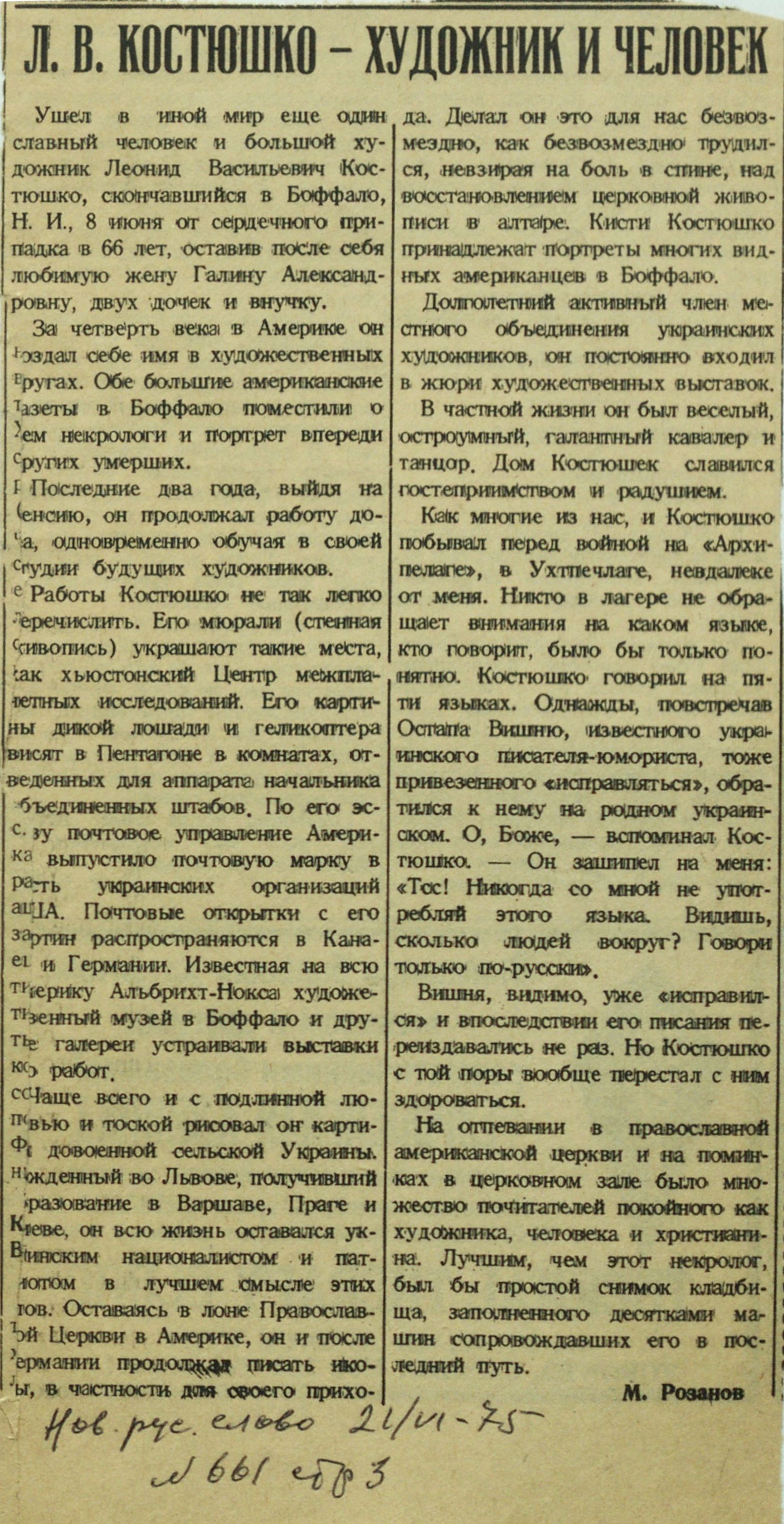 Розанов М. Л.В. Костюшко – художник и человек // Новое русское слово. 1975. 21 июня. Полчанинов Р. Л.В. Костюшко и его карточка // Зарубежная летопись русского искусства. № 33 (март 2013). |